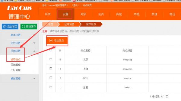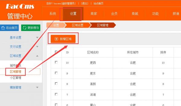 BAOCMS区域设置操作手册:城市站点,区域管理,小区